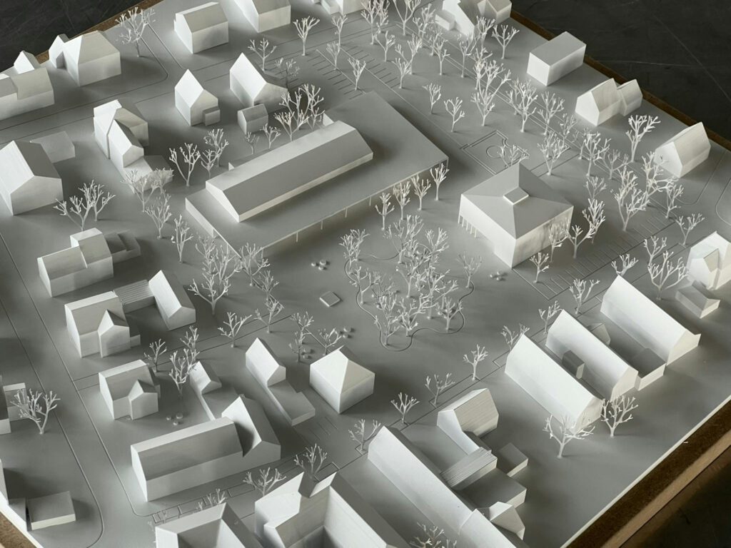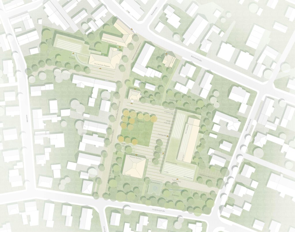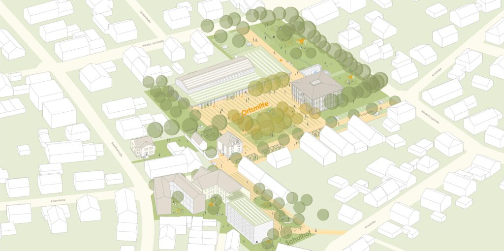 Die umfassende bauliche Neugestaltung rund um das Rathaus, die Mehrzweckhalle sowie die Grundschule bildet das tragende Fundament für eine zeitgemäße, lebendige und identitätsstiftende Ortsmitte in der Gemeinde. Dieses Projekt ist weit mehr als ein rein funktionaler Eingriff – es steht für eine mutige und selbstbewusste Weiterentwicklung des öffentlichen Lebensraums. Der Neubau des Rathauses und die umfassende Modernisierung der Mehrzweckhalle stehen für eine zukunftsorientierte Entwicklung, bei der Bewährtes erhalten und zugleich neue Impulse gesetzt werden. Die bestehenden Strukturen – die Grundschule, das Antoni-Haus sowie das alte Rathaus – werden dabei behutsam in ein gestalterisch überzeugendes und zusammenhängendes Ensemble integriert. Dieses Ensemble schafft räumlich und atmosphärisch eine offene und generationenübergreifende Gemeindekultur, die Begegnung und Miteinander fördert.