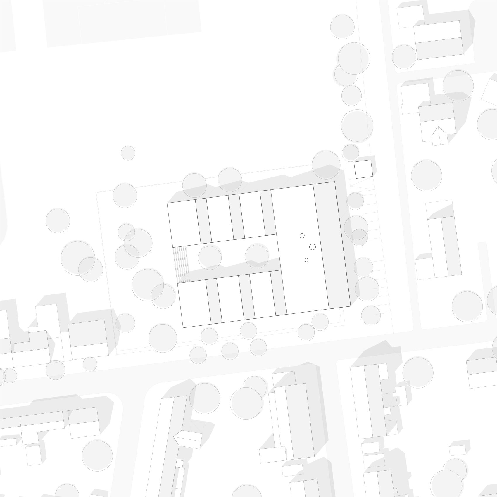 Der Großzügige Vorplatz am östlichen Rand des Baufeldes empfängt die Besucher mit einer Sitzbank im Schatten der weitergeführten Baumreihe, wodurch ein sicheres Ankommen für Eltern und Kinder garantiert wird. Dieser großzügige Vorplatz schafft gleichzeitig die öffentliche Verbindung zu den dahinterliegenden Sportfeldern von Süden. Entlang des Vorplatzes sind im Nord-Osten des Gebäudes die extern genutzten Räume für die Sportflächen wie selbstverständlich angeordnet. An der südlich angrenzenden Wilhelmstraße sind auf kurzem Wege die Bushaltestelle, Fahrradstellplätze sowie zwei zusätzliche Besucherstellplätze angegliedert.