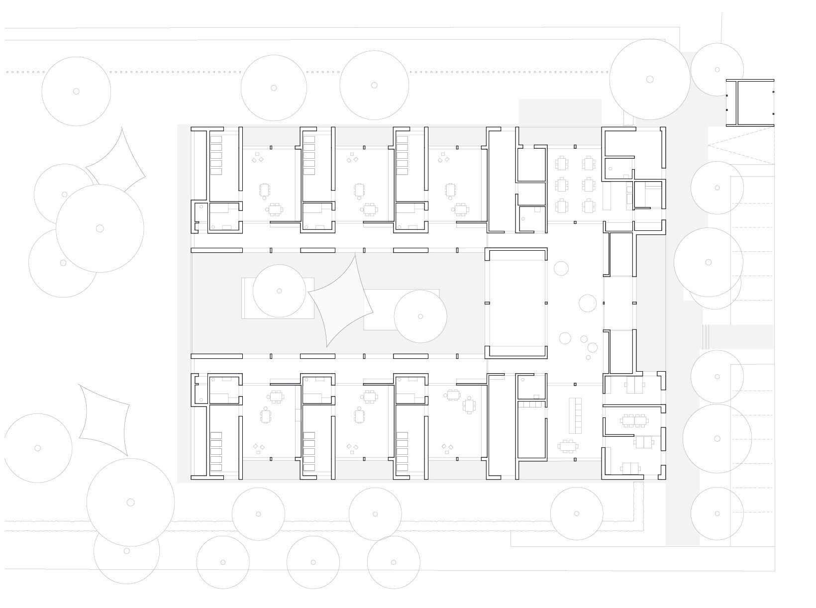 Die PKW-Stellplätze für das Personal sind weiter östlich unter Bäumen angeordnet. Über Rasengitterbeläge werden die Stellplätze im ökologischen Sinne in die Gesamtgestaltung eingebettet. Der Baumüberstand gliedert die Parkbereiche, spendet Schatten und bildet genügend Puffer zur angrenzenden Wohnbebauung. Die Andienung der Küche erfolgt ebenfalls direkt von diesem Vorplatz aus.