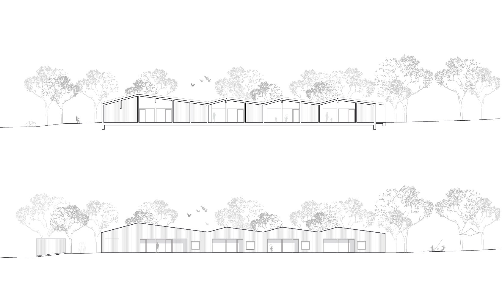 Die Gebäudehüllen, bestehend aus Wänden und Dach, sind als hochgedämmte Holzkonstruktion konzipiert. So können z.B. die KfW-40 Anforderungen auf einfache Weise erreicht werden. Das begrünte Dach kann in Teilen mit einer PV-Anlage belegt werden, die den benötigten Strom für das Gebäude erzeugt. Die Räume werden durch die großzügigen überdachten Terrassen natürlich verschattet, wodurch der Wärmeintrag im Sommer auf ein Minimum reduziert werden kann. Die Wärmegewinnung für die angedachte Fußbodenheizung kann über eine Luft-Wasser-Wärmepumpe (alternativ Erdsonde) erzielt werden. Akustische Maßnahmen sowie die Beleuchtung der Räume können direkt in die geschlitzte Holzdecke integriert werden.