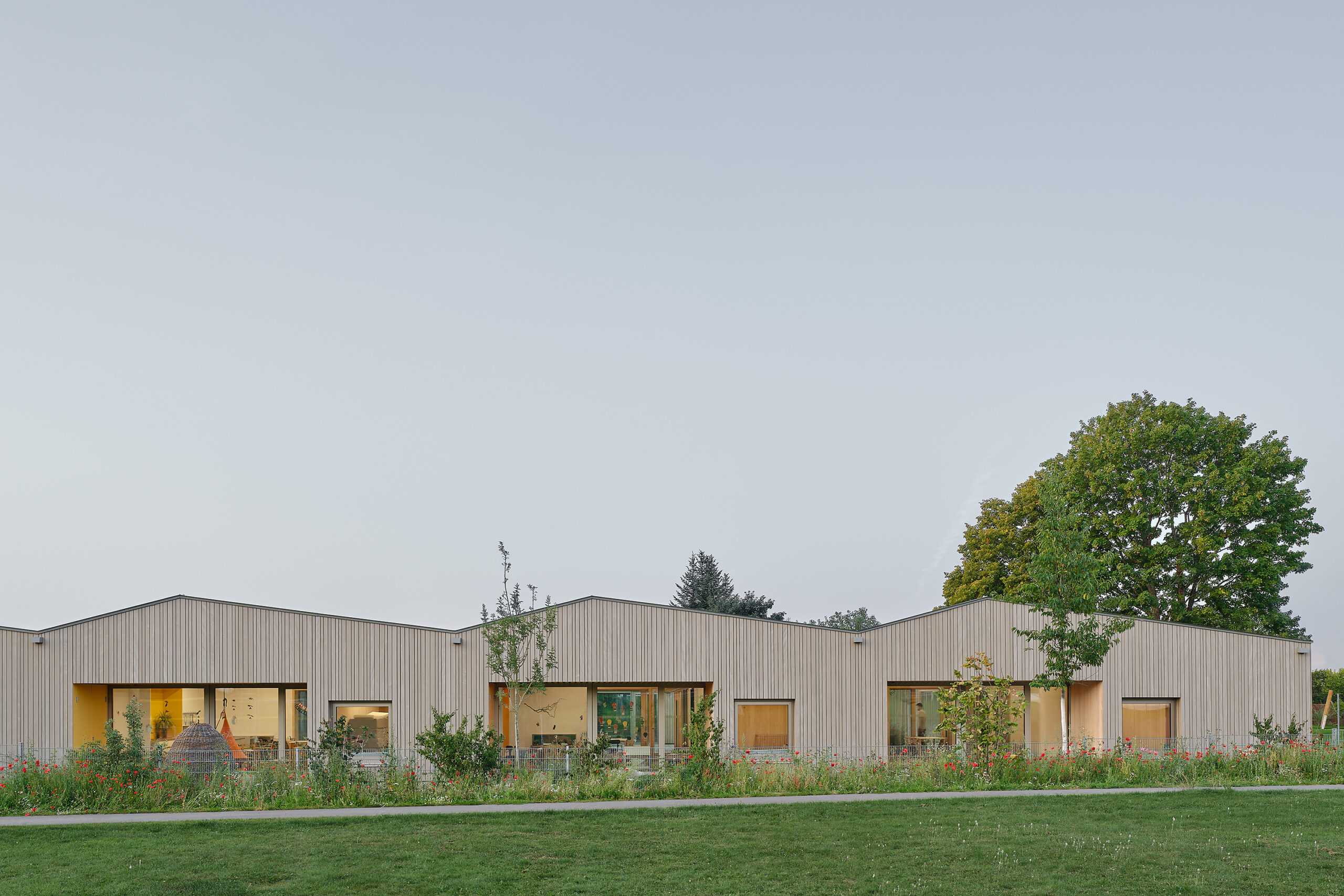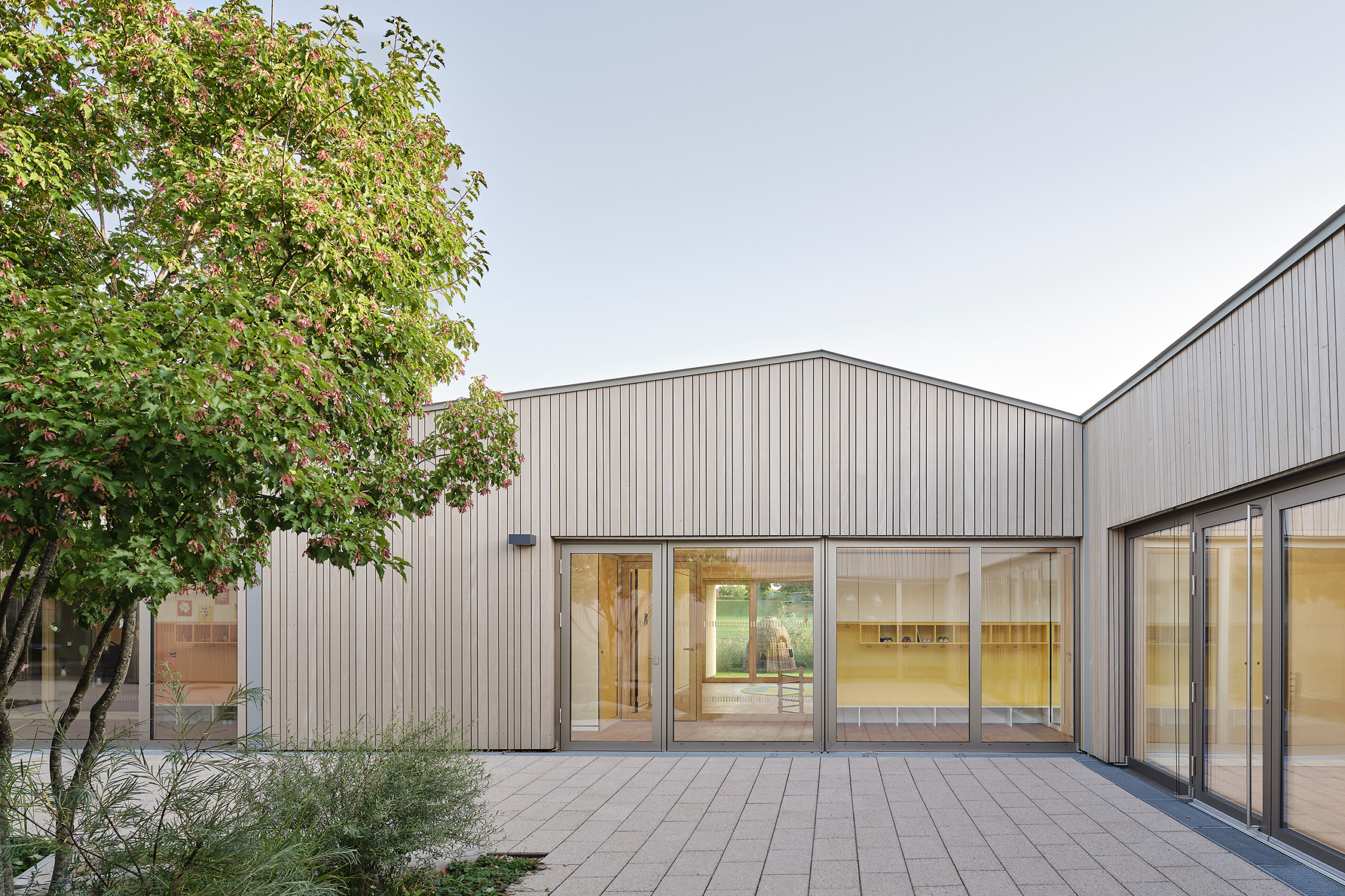Der Neubau des Kindergarten Bitz wird als eingeschossiger Holzbau abgerückt von der Wilhelmstraße in das Grundstück eingefügt. Die Positionierung des Gebäudes auf dem Grundstück schafft eine klare Trennung zwischen öffentlicher und privater Außenanlage.