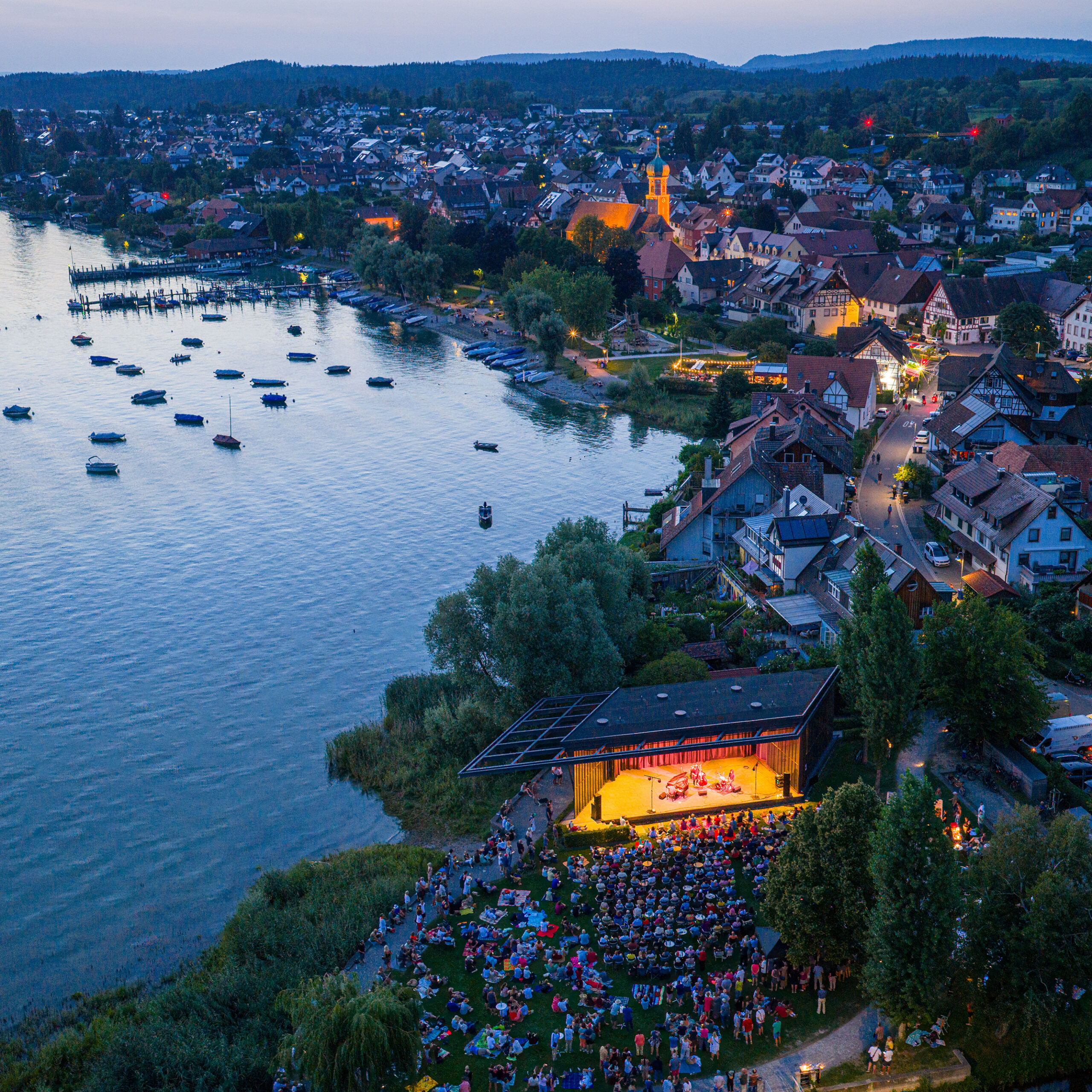 Der Standort für die Seebühne liegt sehr prominent im Seegarten in einer öffentlichen Parkanlage in der Ortsmitte von Allensbach, direkt am Gnadensee mit traumhaftem Panoramablick auf den Ort, den See, die Reichenau, die Mettnau und den Hegaubergen sowie der Höri und den Schweizer Alpen.